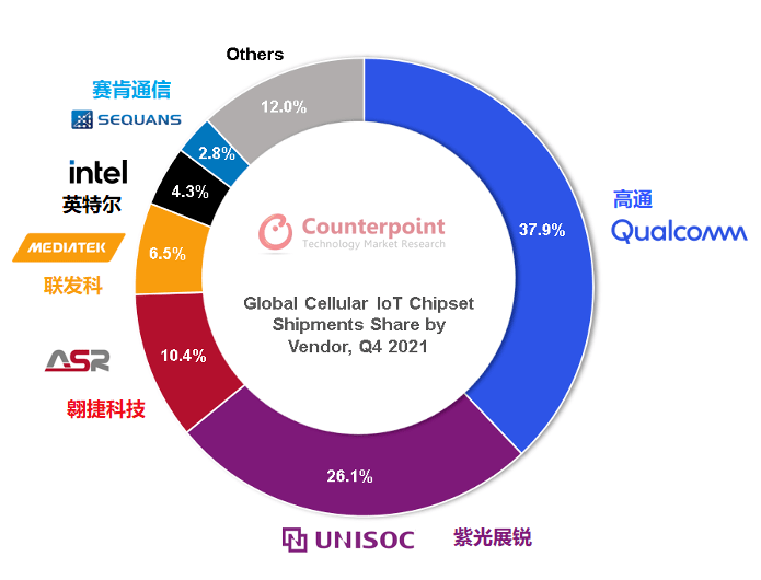 幾乎所有物聯(lián)網(wǎng)終端都需搭載IoT通信芯片,因而通信射頻芯片能夠直觀反映物聯(lián)網(wǎng)行業(yè)的成長(zhǎng)周期與終端需求,堪稱行業(yè)風(fēng)向標(biāo)。在Counterpoint發(fā)布的全球蜂窩物聯(lián)網(wǎng)芯片追蹤報(bào)告中,高通、紫光展銳、翱捷科技、聯(lián)發(fā)科、英特爾、Sequans、華為海思等占據(jù)了大部分市場(chǎng)份額。