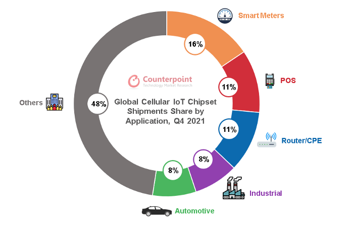隨著傳統(tǒng)行業(yè)自動(dòng)化升級(jí),物聯(lián)網(wǎng)在垂直領(lǐng)域終端用戶的滲透率提升,物聯(lián)網(wǎng)芯片市場(chǎng)快速增長(zhǎng),前瞻產(chǎn)業(yè)研究院分析預(yù)計(jì),2022年我國(guó)物聯(lián)網(wǎng)芯片市場(chǎng)規(guī)??蛇_(dá)857億元人民幣,有望在2024年達(dá)到千億規(guī)模,來(lái)自Counterpoint的數(shù)據(jù)顯示,中國(guó)消耗了全球近60%的蜂窩物聯(lián)網(wǎng)芯片。
